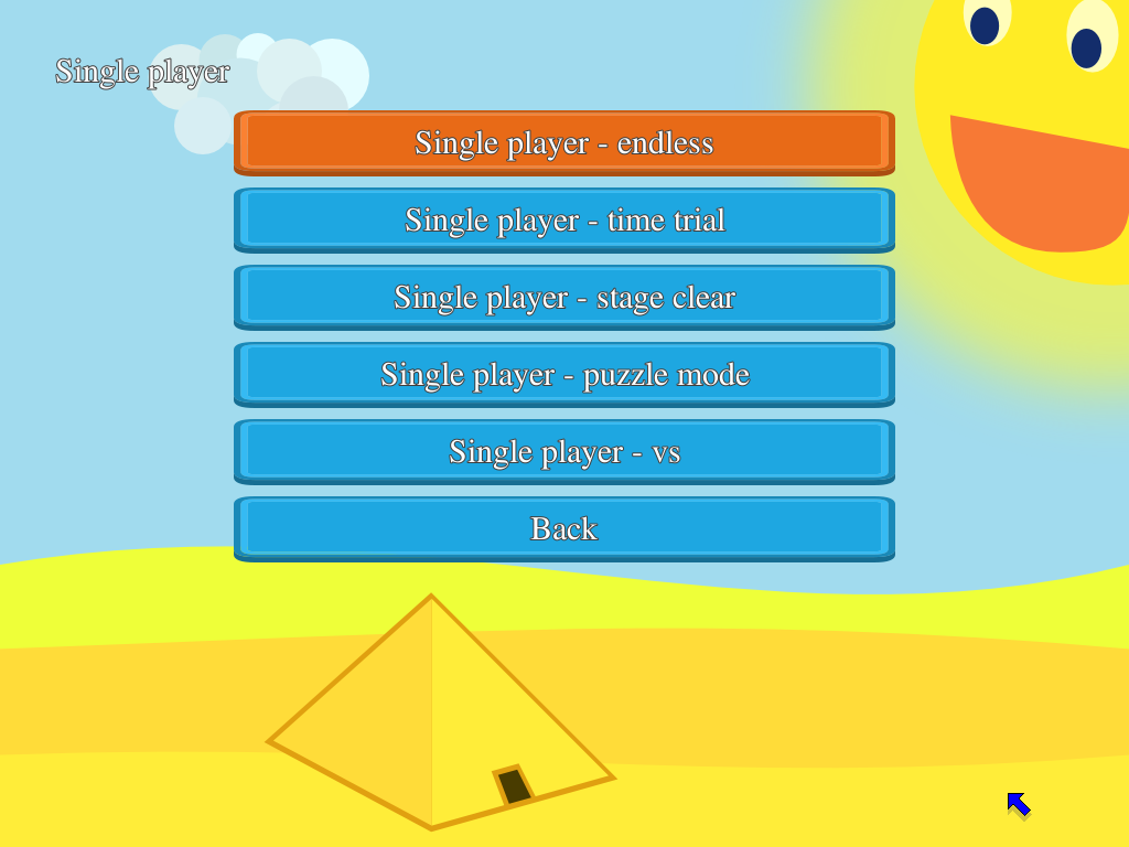 I have uploaded a new video that shows all gametypes and also shows how to change key mapping. Apparently the key mapping is one of the major problems in the game. The default key setting: Left, Right, Up, Down, RShift and RCtrl is not logical. Perhaps Left shift and ctrl would be better. In my last update I wrote about my plans for future versions. The current SVN version does have some of those features: Like a menu system that can be navigated without a mouse, must hard coded texts have also been replaced by translatable strings. One of the things that personally annoys me the most is that I must move my hands from the keyboard/game pad to the mouse to start a new game. This will go hopefully go away. For now here is the video.