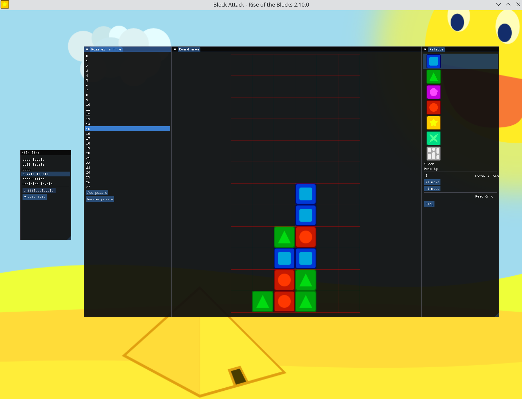 There is now a working Level Editor for the Puzzle mode. It has a GUI and should be relative easy to use. It’s written in Java and should run on most machines. Although almost no documentation.